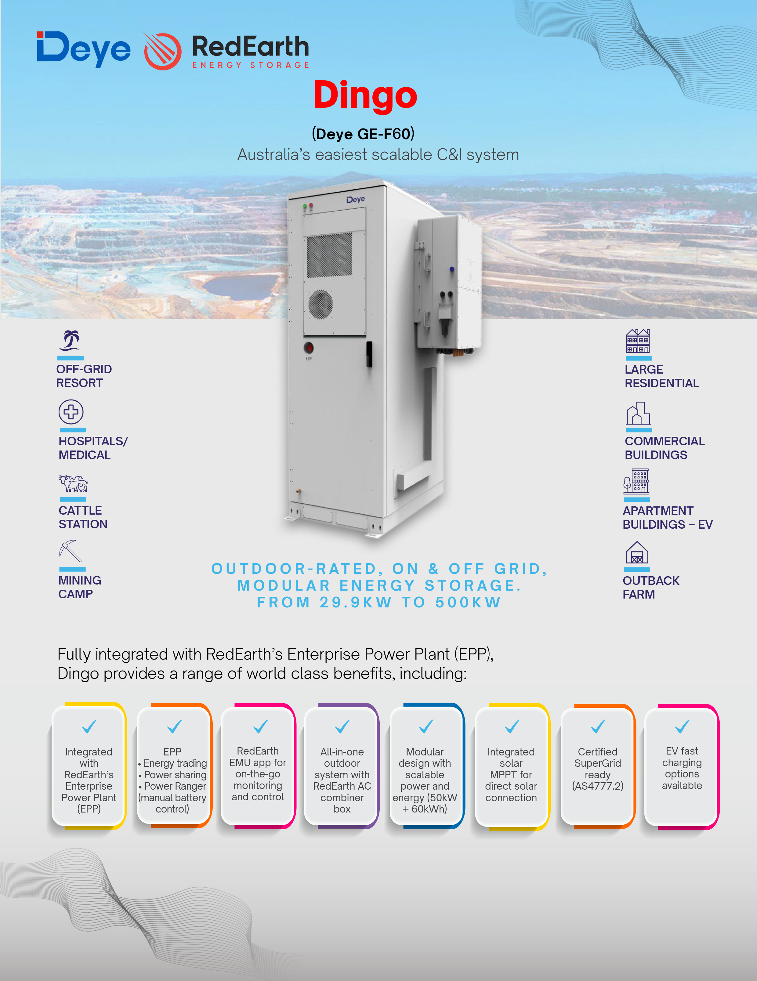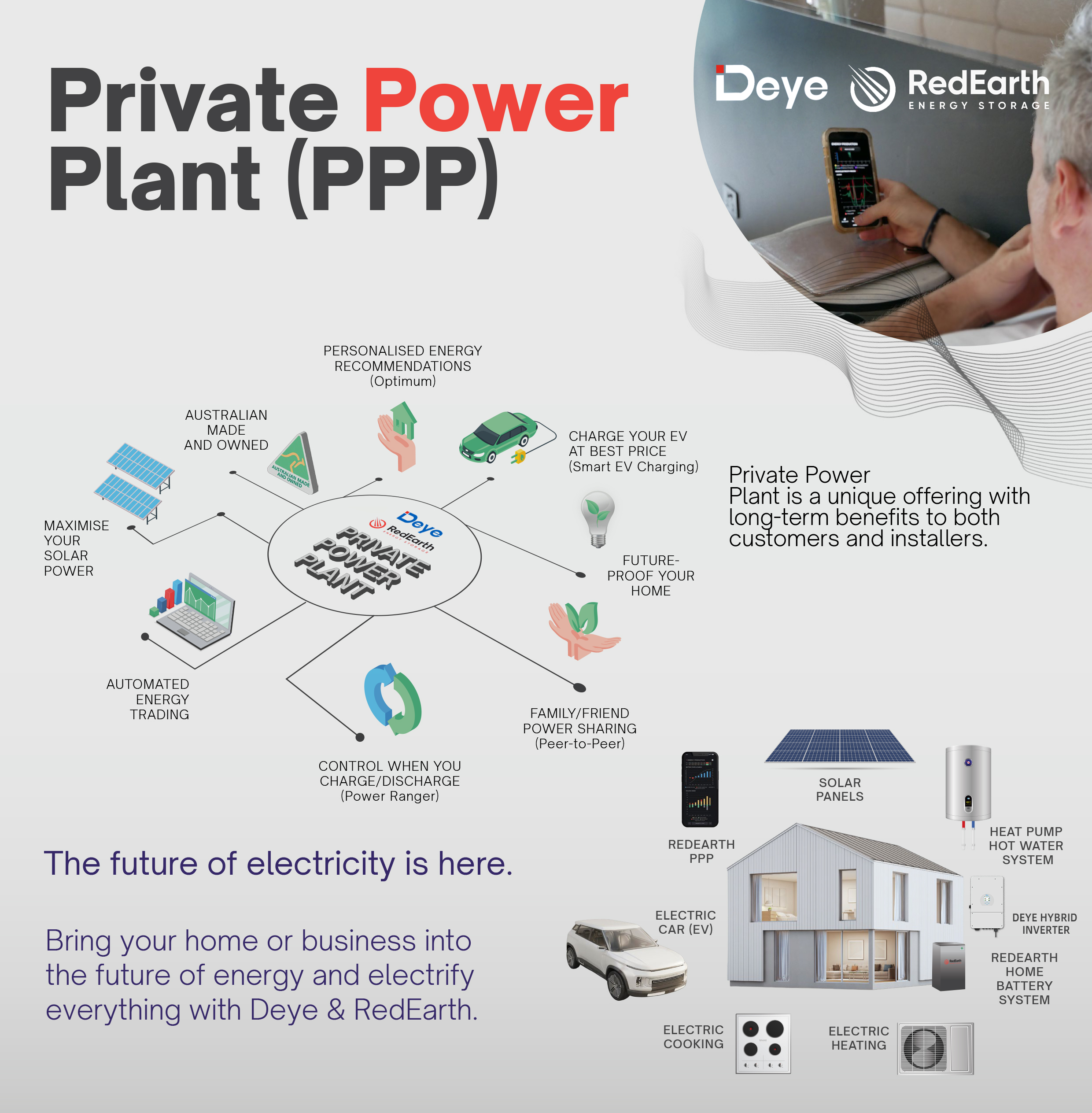 Deye vinh dự được thông báo về sự hợp tác với Redearth sau khi thử nghiệm sâu rộng thành công về phạm vi biến tần lai nâng cao của Deye với nền tảng phần mềm Power Power (PPP) của Redearth để tối đa hóa lợi nhuận tài chính cho người dùng cuối ở Úc thông qua quản lý năng lượng năng động. Dedearth cũng đã chứng nhận pin Troppo phổ biến của họ để sử dụng với các bộ biến tần DEYE LV. Dedearth hiện đang cung cấp một loạt các hệ thống Bess tất cả trong một bằng cách sử dụng bộ biến tần DEYE và pin Troppo, hiện có sẵn để bán ở Úc và Nam Thái Bình Dương và tương thích trên nền tảng Nhà máy điện riêng (PPP) của Redearth.